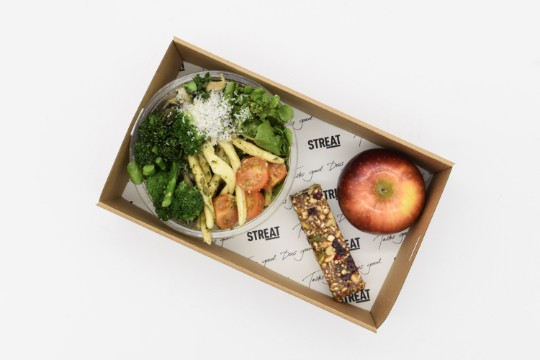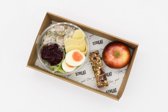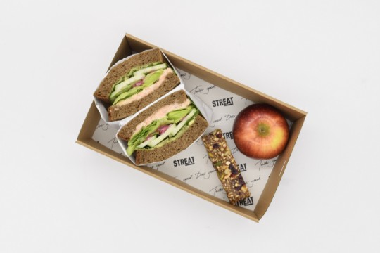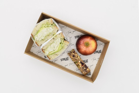 Individually packaged lunch boxes with the choice of a STREAT sweet treat and the option to add on a beverage.